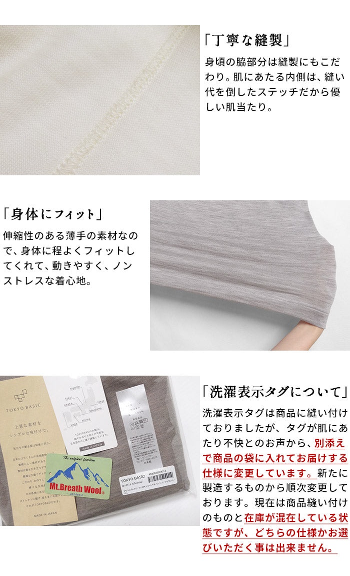 天然ウール100%でありながら多くの機能を持つ「マウントブレスウール」オールシーズン対応!温度調節・天然の抗菌防臭・優れた吸放湿性・ウォッシャブルウール・チクチクしにくいソフトタッチ・動きやすいストレッチ性。人気のマウントブレスウールから、インナーとしても、一枚着としても何かと使える五分袖タートル登場。見た感じも、触った感じもウールとは思えない。でも、極細のウール糸を使って編み立てた生地だから、風合いはサラサラ。汗をかいても直ぐに吸い取るからオールシーズン着られます。