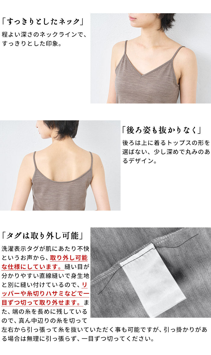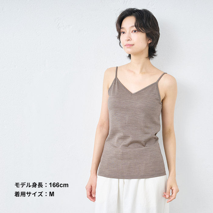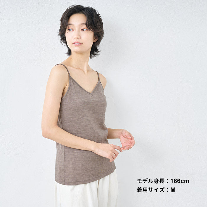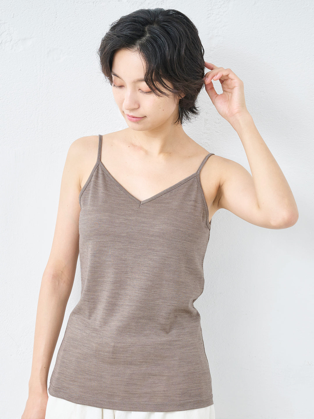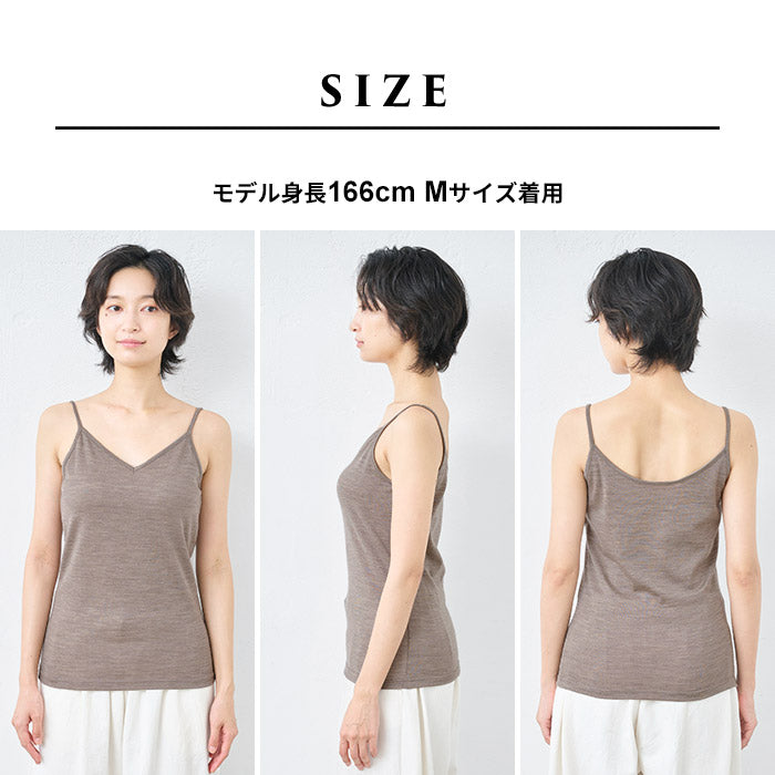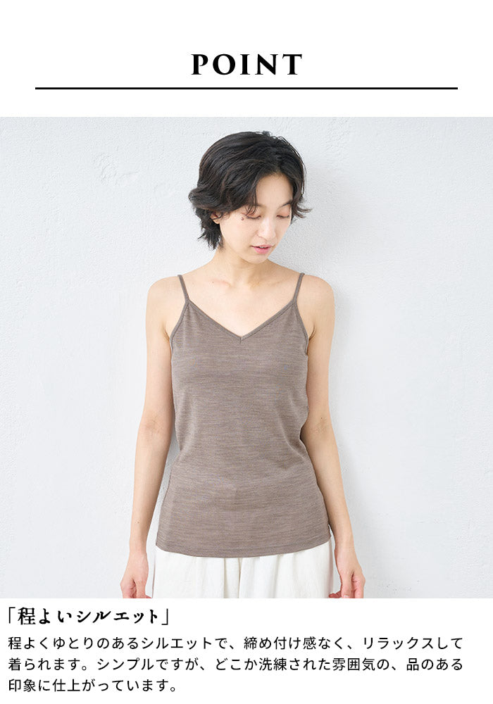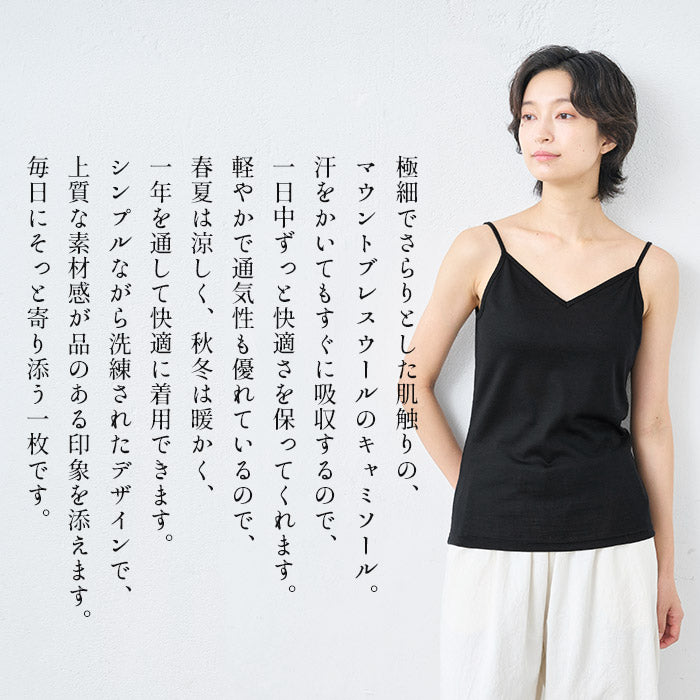 | 極細でさらりとした肌触りの、マウントブレスウールのキャミソール。汗をかいてもすぐに吸収するので、一日中ずっと快適さを保ってくれます。軽やかで通気性も優れているので、春夏は涼しく、秋冬は暖かく、一年を通して快適に着用できます。シンプルながら洗練されたデザインで、上質な素材感が品のある印象を添えます。毎日にそっと寄り添う一枚です。 | サイズ |