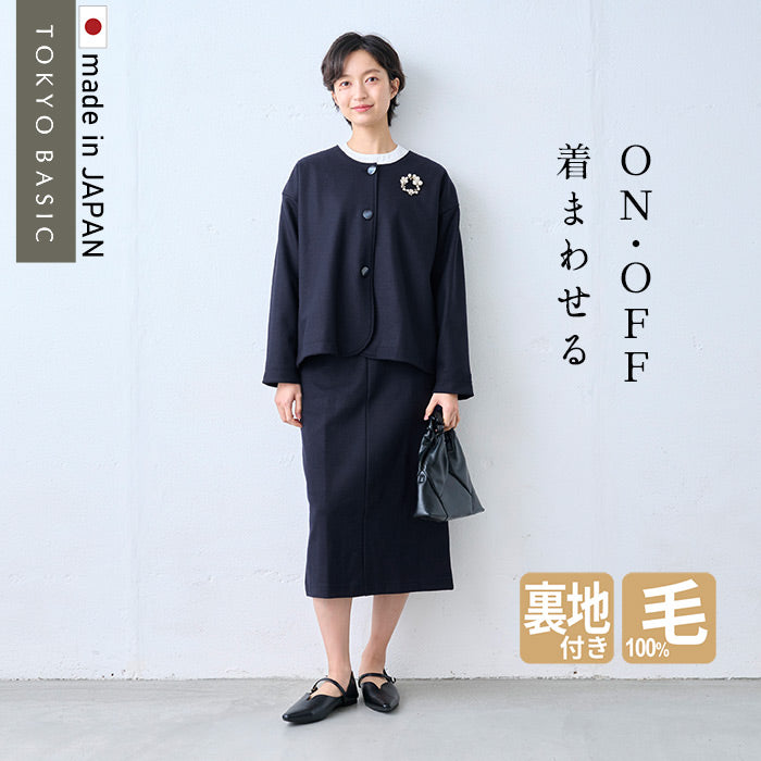 圧縮ウール100% 裏地付き ノーカラージャケット + ロングスカート 2点セット
